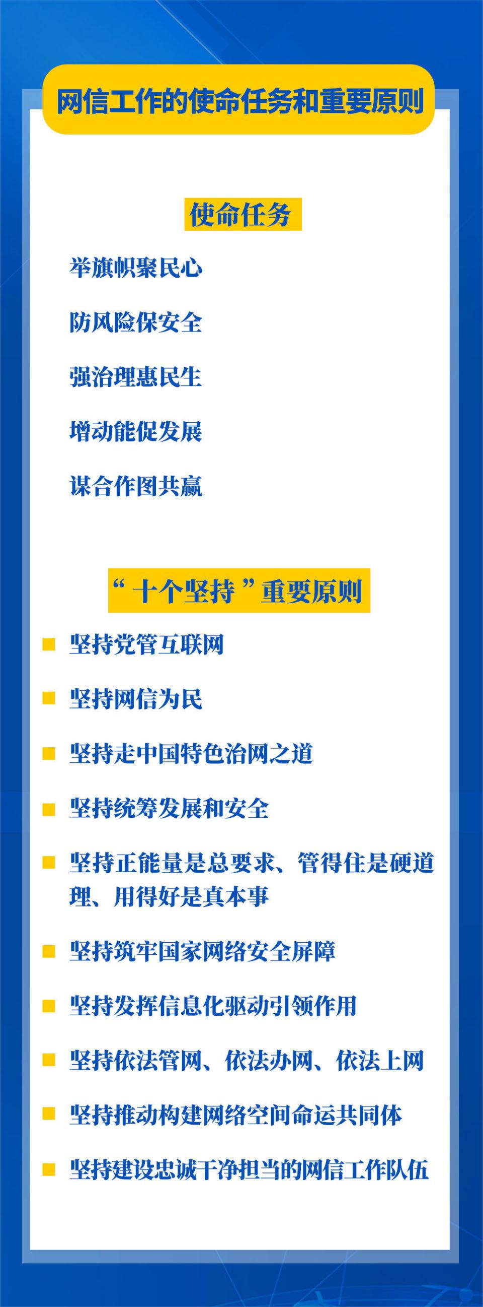 習(xí)近平總書記鮮明提出的網(wǎng)信工作“5個方面、30個字”的使命任務(wù),涵蓋互聯(lián)網(wǎng)內(nèi)容建設(shè)、網(wǎng)絡(luò)安全、網(wǎng)絡(luò)惠民、信息化建設(shè)、國際網(wǎng)絡(luò)空間治理等,“十個堅持”重要原則進(jìn)一步豐富和發(fā)展了習(xí)近平總書記關(guān)于網(wǎng)絡(luò)強(qiáng)國的重要思想,把黨對網(wǎng)信工作的規(guī)律性認(rèn)識提升到全新高度??倳浱岢龅氖姑蝿?wù)和重要原則,具有很強(qiáng)的政治性、戰(zhàn)略性、指導(dǎo)性,既著眼當(dāng)前,又謀深慮遠(yuǎn),為做好新時代新征程網(wǎng)信工作指明了前進(jìn)方向,為推進(jìn)實現(xiàn)網(wǎng)絡(luò)強(qiáng)國提供了根本遵循。